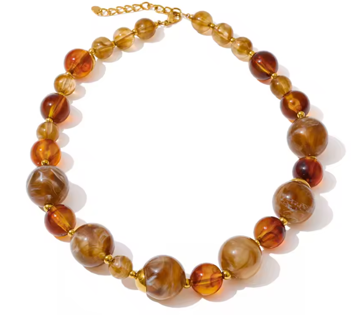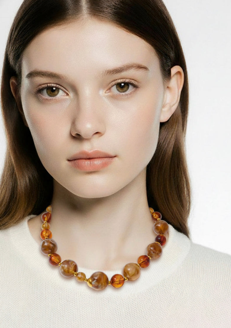 A celebration of autumn’s golden glow, this necklace blends warm amber tones and organic shapes, evoking nature’s enduring elegance