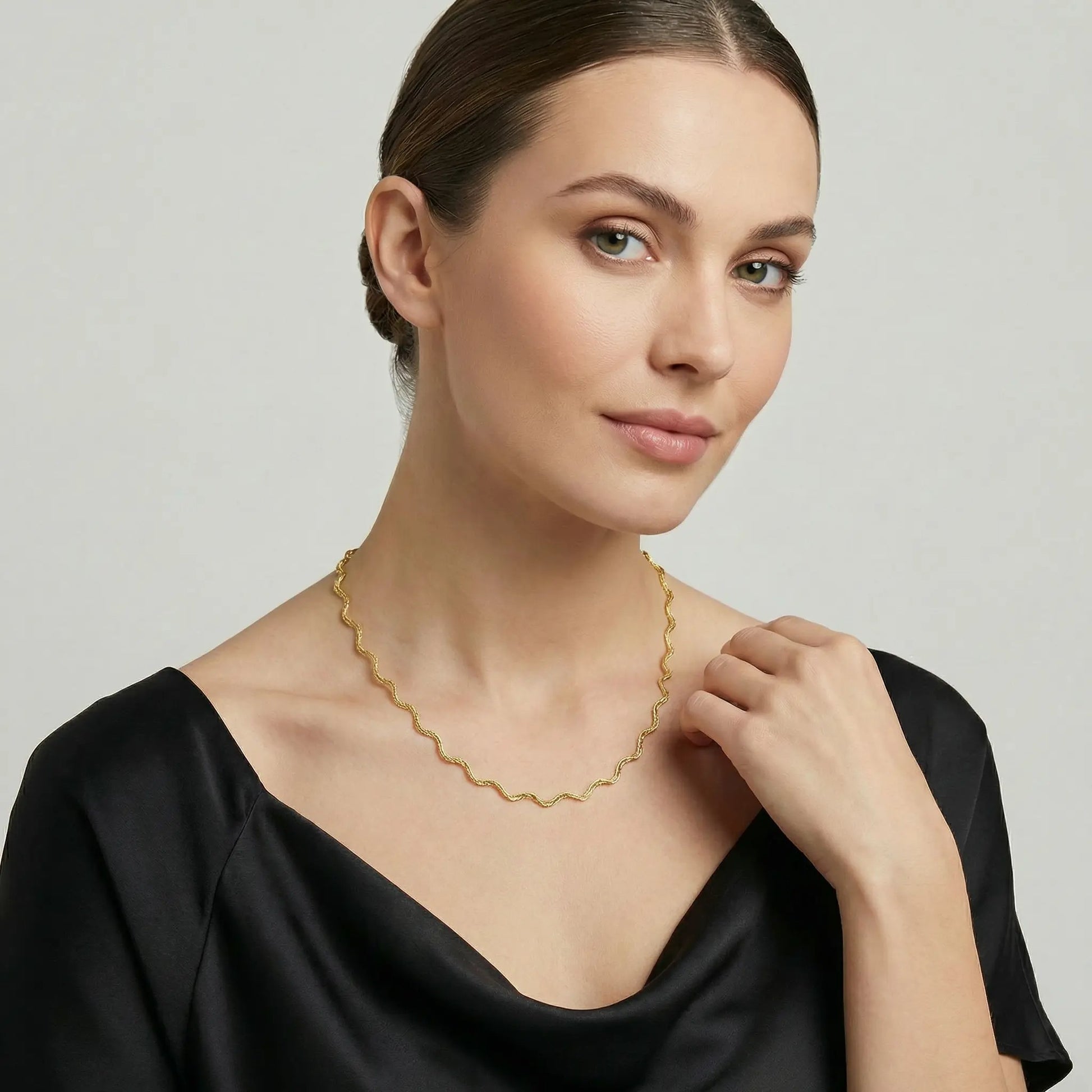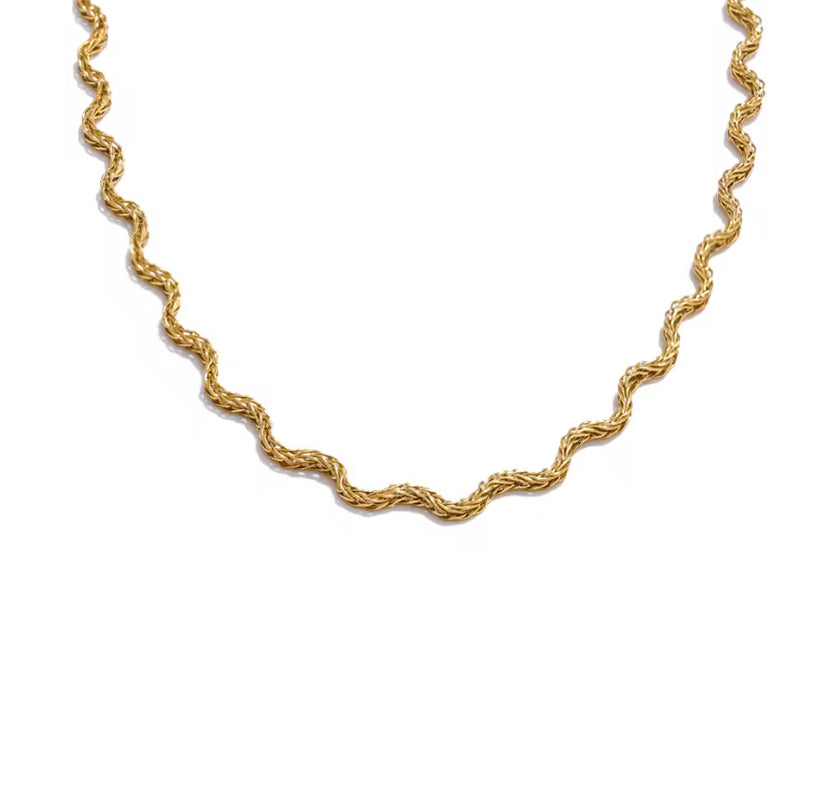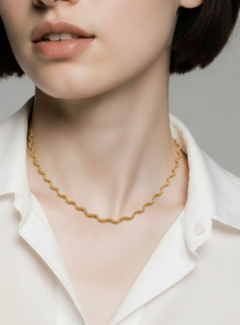 This wavy chain necklace exudes subtle French elegance, timeless, fluid lines that drape gracefully on the collarbone.