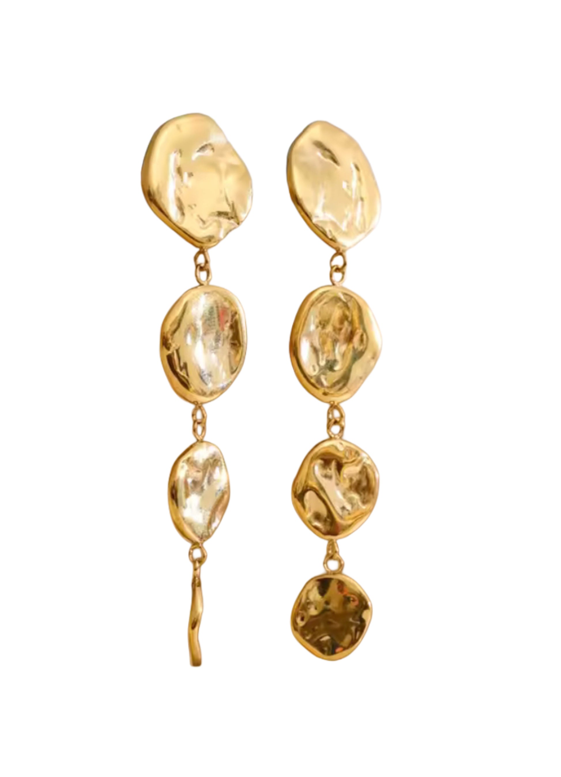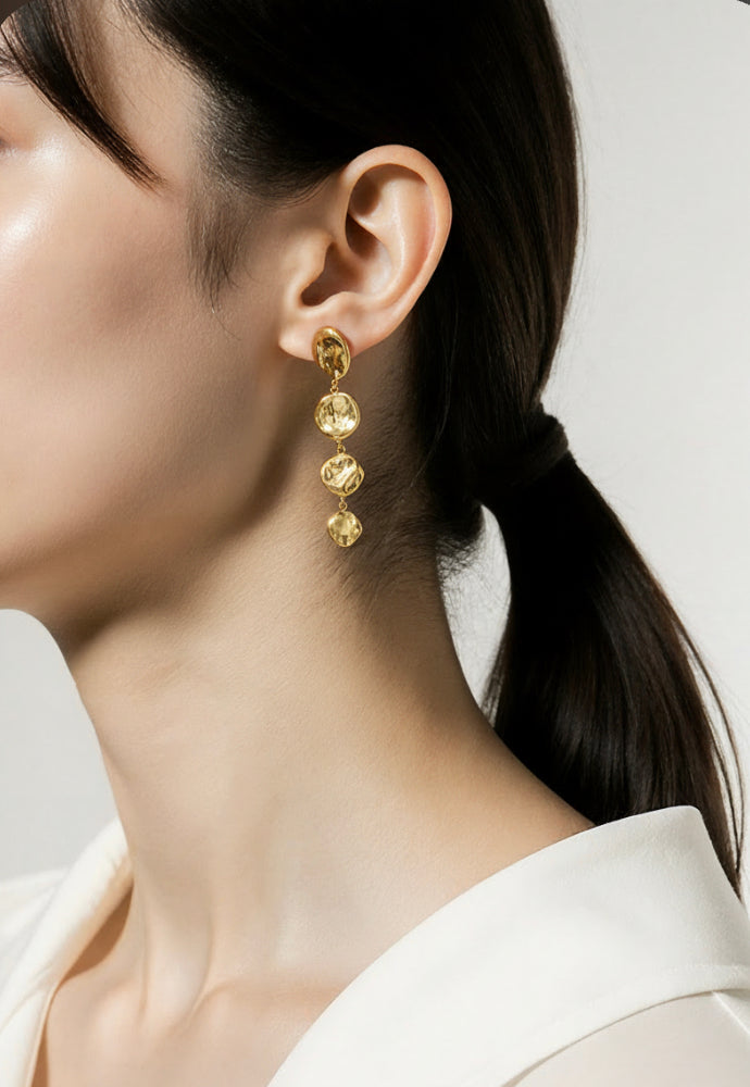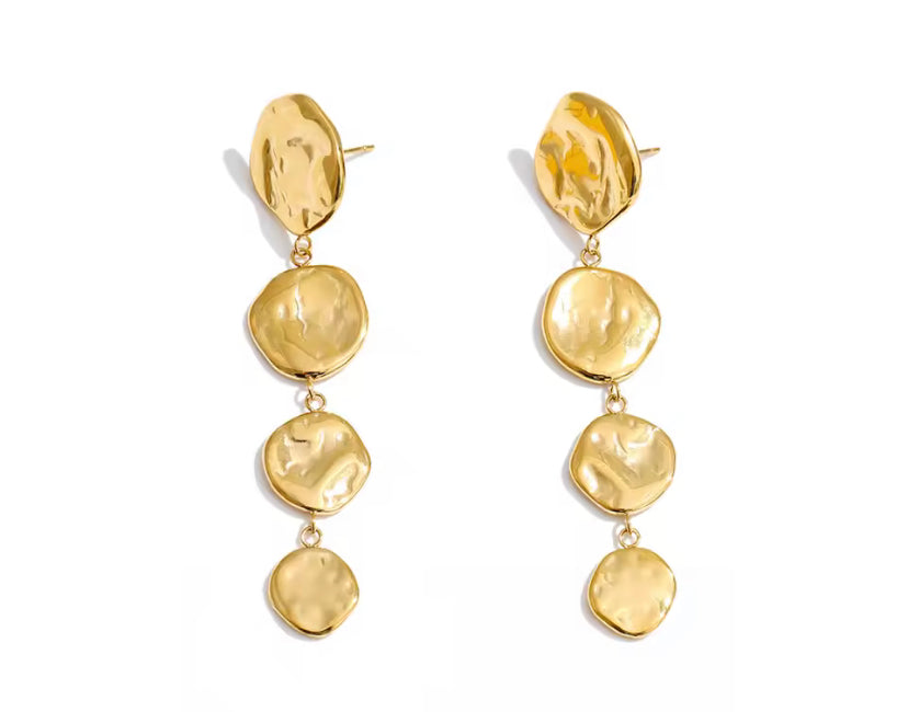 The hammered, organic discs give a very “liquid gold” , sculptural vibe, chic but still minimalist.